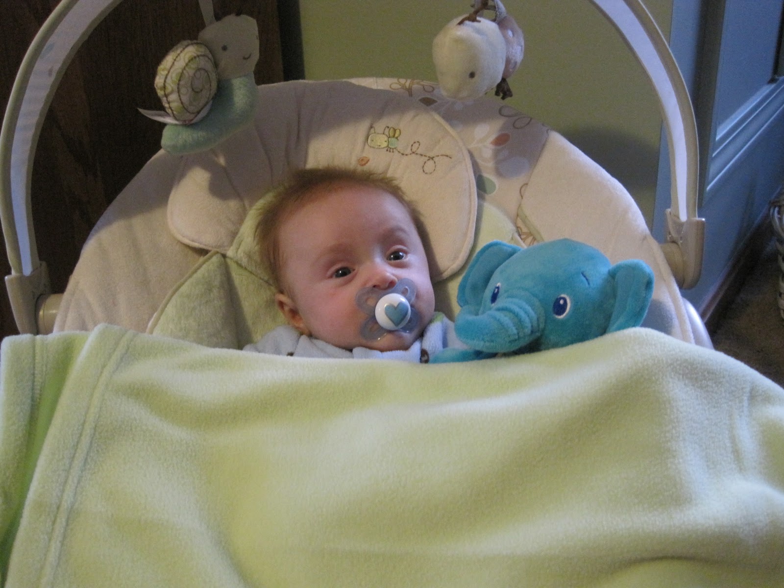 Ty's naps changed this week. The only nap that is predictable is the first AM nap. He eats first thing in the morning (between 6:45 and 7:30) and then goes right back to sleep for about 2 hours. This week he would only nap for the last 45 minutes to 1 hour before his next meal, but sometimes he wouldn't sleep at all! Gone are the days of his long afternoon nap of 2 to 2.5 hours. I miss that nap time! That is when I would get something accomplished! But things might keep changing. His naps overall have been pretty erratic. After only having 1 afternoon nap of 30 minutes on Monday, I was desperate on Tuesday. I usually have Tyson get sleepy, either in his bouncer, his swing, or my arms and then I put him down in his pack 'n play to sleep. Well, on Tuesday afternoon, he was fully asleep in his swing and I decided that I was not going to move him. Well, wouldn't you know that it had to be the time when my friends, the Jehovah's Witnesses, came to my door! The dogs went crazy barking, of course, and woke Ty up. They came in for awhile, but thank goodness I was able to get him back to sleep (with the help of the binky). I had not seen them for about a month, so it just had to be the day that it was essential that Tyson got an afternoon nap!